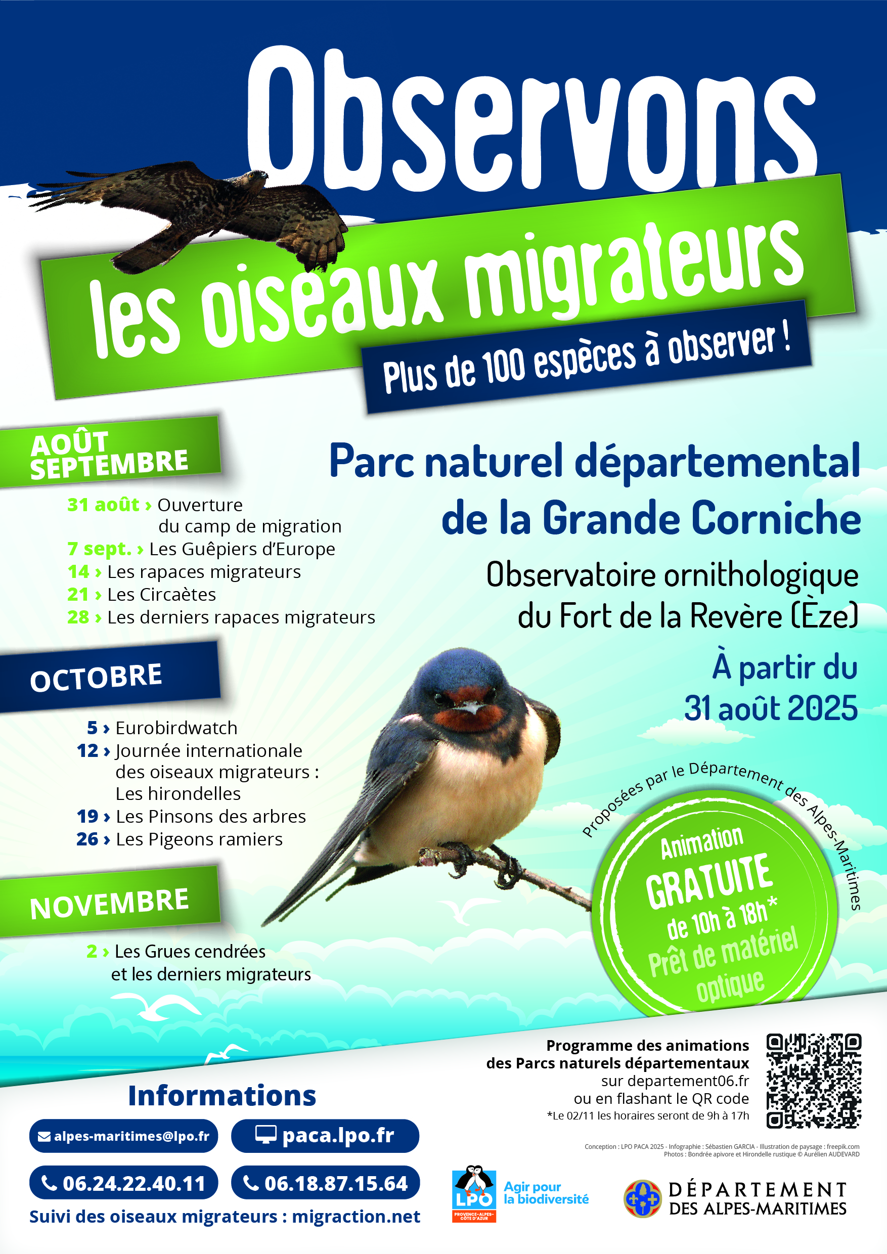 Le 13 octorbe dernier, ornithologues de la LPO PACA, bénévoles, spotteurs et amoureux des oiseaux s’étaient donné rendez-vous au Parc naturel départemental de la Grande-Corniche pour la journée internationale des oiseaux migrateurs. C’est à l'observatoire ornithologique du Fort de la Revère que nous avons accueilli 74 visiteurs venus admirer le spectacle de la migration des oiseaux et en apprendre un peu plus sur ce phénomène. Chaque année, plus d’une centaine d’espèces d’oiseaux migrateurs, et plus de 120 000 individus, traversent le ciel des Alpes-Maritimes pour se diriger vers l’Afrique ou l’Espagne.